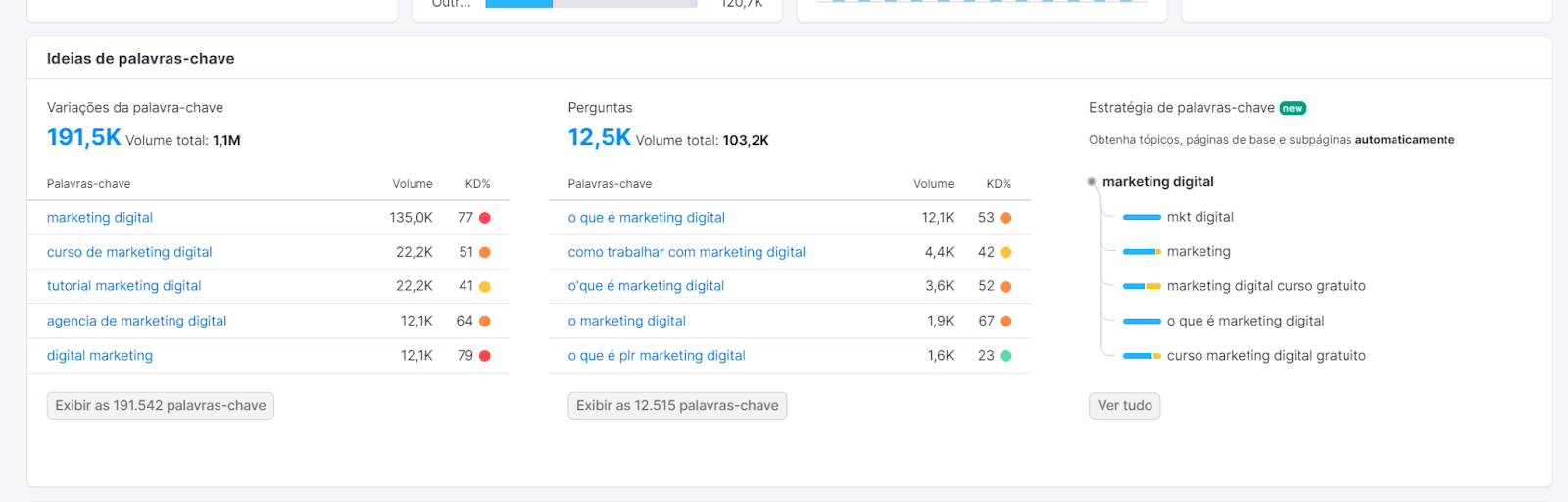 Portanto, a keyword “marketing digital” possui 135.000 buscas mensais, e uma dificuldade de 77% em relação à concorrência.